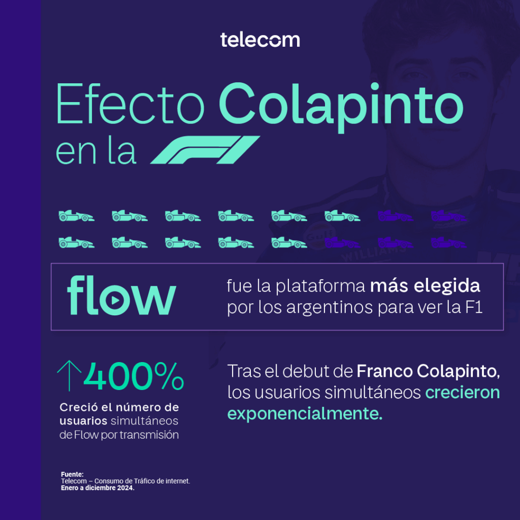 Algo que me pareció espectacular es cómo impactó el debut de Franco Colapinto en la Fórmula 1. Fue un verdadero boom. Flow, la plataforma de streaming de Telecom, rompió récords de usuarios conectados durante esas transmisiones. Definitivamente, ver a un argentino competir al más alto nivel siempre nos engancha.