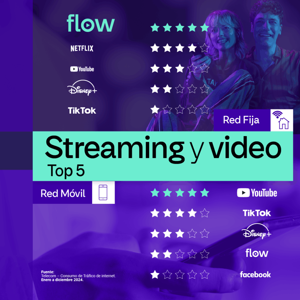En cuanto a plataformas, Flow lideró el consumo de datos en redes fijas, gracias a su oferta de TV en vivo, estrenos, deportes y recitales. En cambio, en la red móvil, los reyes siguen siendo YouTube, TikTok y Disney+, mostrando cómo el consumo se adapta según el dispositivo y el momento del día.