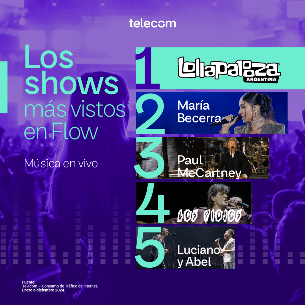 Otro dato interesante: los festivales y recitales en vivo también generaron picos de conexión. El Lollapalooza Argentina fue uno de los eventos más seguidos en Flow, junto con shows de artistas como María Becerra, Paul McCartney, Los Piojos y el dúo Luciano Pereyra–Abel Pintos.