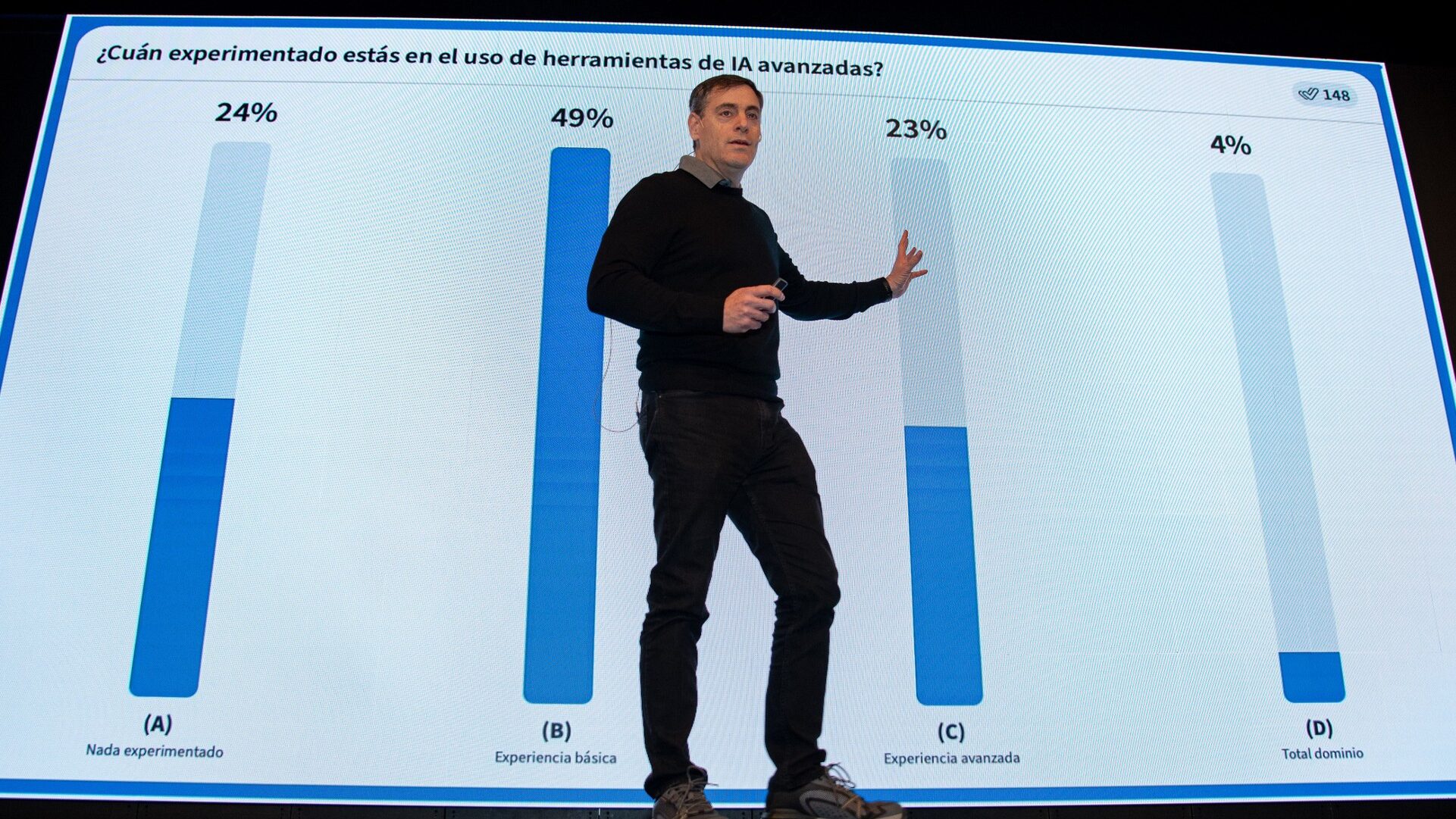 Bilinkis respaldó sus dichos con datos, citando estudios que demuestran un aumento del 40% en la productividad al trabajar con IA. A su vez, expuso una realidad preocupante del sector: «2 de cada 3 CTOs no entienden inteligencia artificial» , y concluyó con un llamado a la acción para los líderes presentes: «No sean el freno para sus organizaciones».