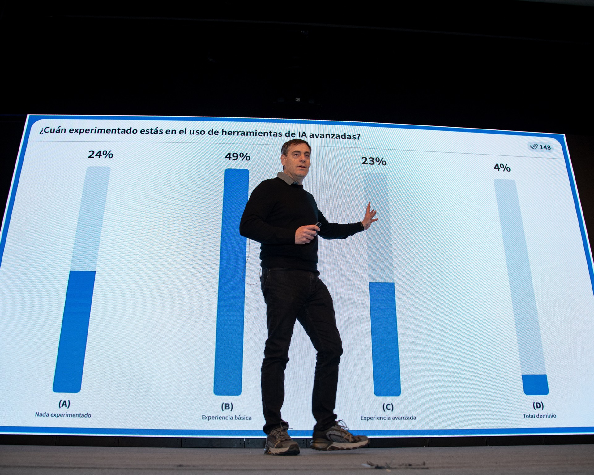 Bilinkis respaldó sus dichos con datos, citando estudios que demuestran un aumento del 40% en la productividad al trabajar con IA. A su vez, expuso una realidad preocupante del sector: «2 de cada 3 CTOs no entienden inteligencia artificial» , y concluyó con un llamado a la acción para los líderes presentes: «No sean el freno para sus organizaciones».